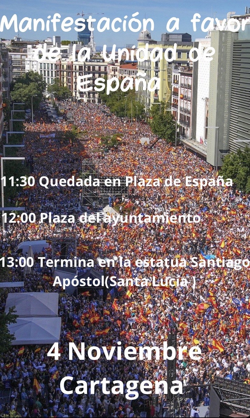 Tras el pacto PSOE-ERC que se negocia, que incluye el 'perdón' de Carles Puigdemont, y "por las continuas cesiones de Pedro Sánchez (presidente del gobierno de España) al independentismo y las ilegalidades cometidas", un grupo de ciudadanos convoca para este 4 de noviembre una manifestación a favor de la unidad de España en Cartagena, que comenzará a las 11.30 horas en la plaza de España y culminará en Santa Lucía.