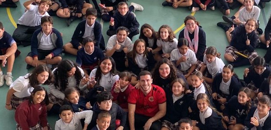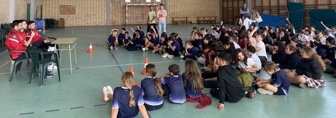 Por otro lado, la visita al colegio Hispania se realizó en el pabellón deportivo del centro, donde cerca de un centenar de niños y niñas esperaban la llegada de los tres internacionales.