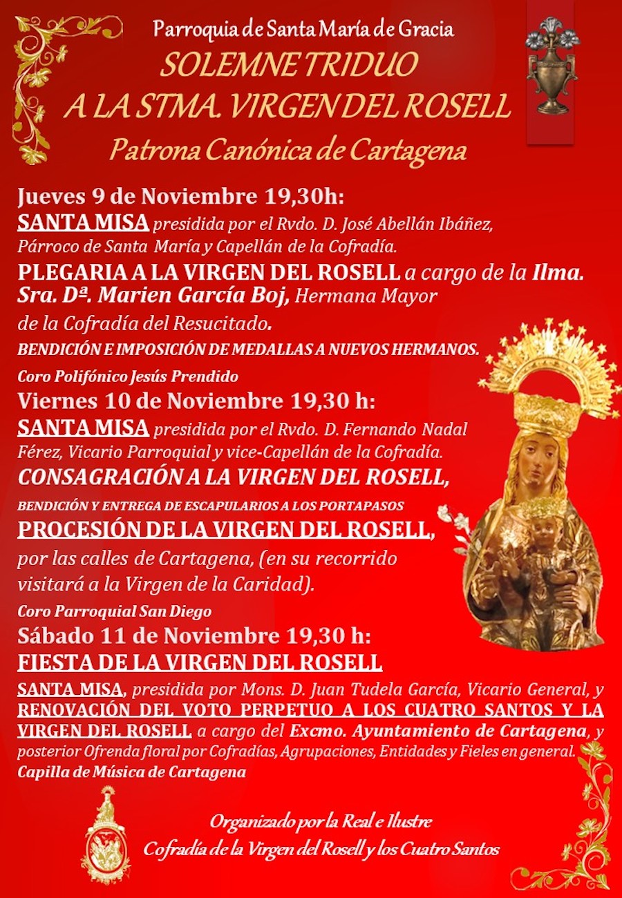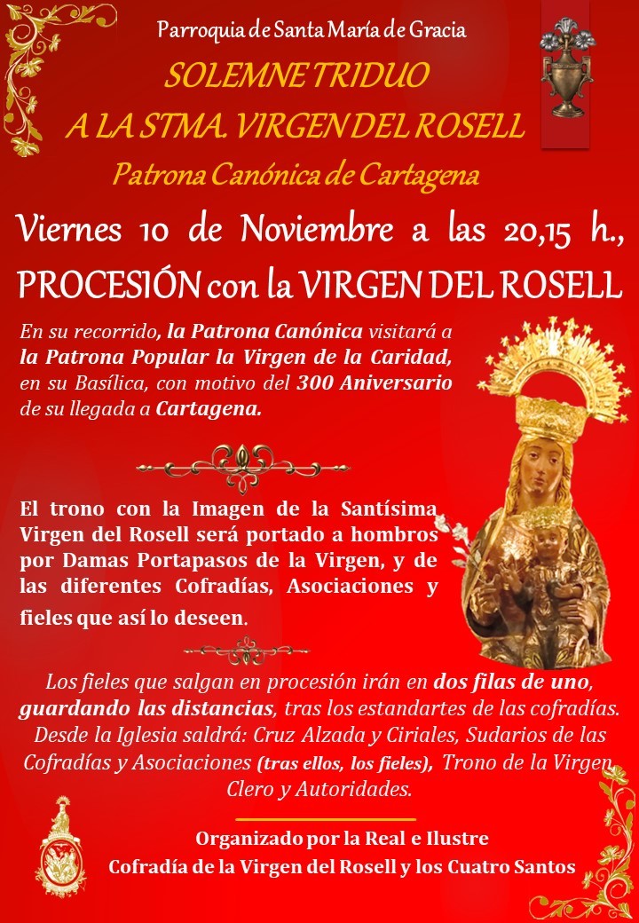 Con motivo del 300 aniversario de la llegada a la ciudad de la Virgen de la Caridad, la patrona más antigua (posiblemente de los siglos XII o XIII) de Cartagena, la Virgen del Rosell, irá a la real basílica de la más popular y oficial este viernes, durante el recorrido de la procesión que llevará a cabo a hombros. Organiza la Real e Ilustre Cofradía de la Virgen del Rosell y los Cuatro Santos de Cartagena.