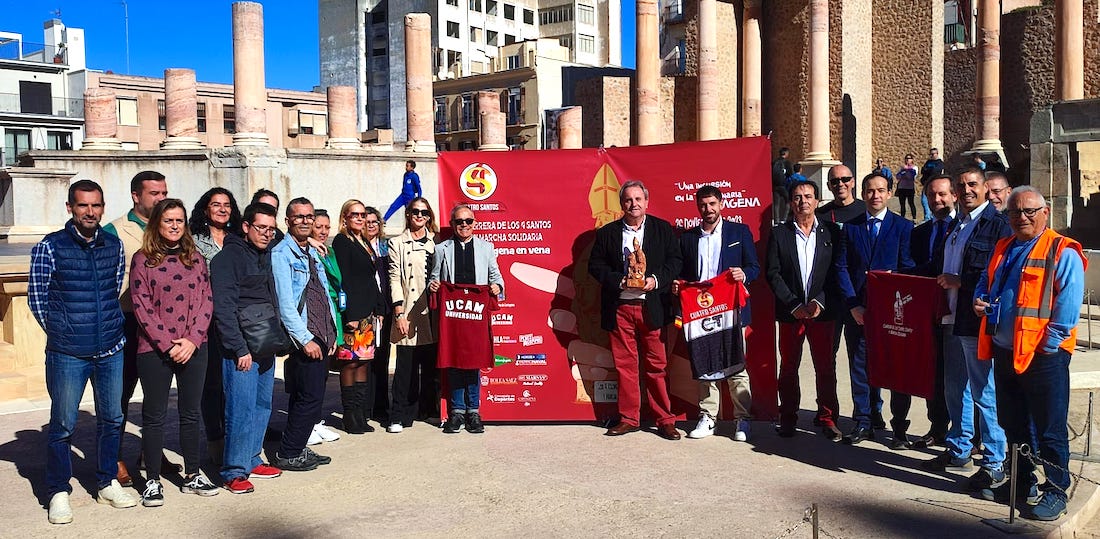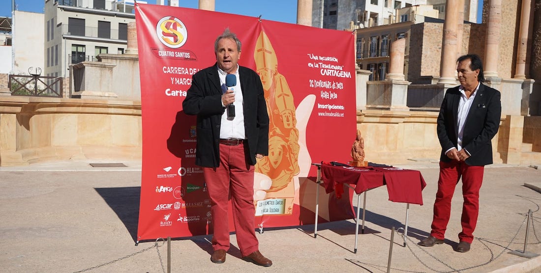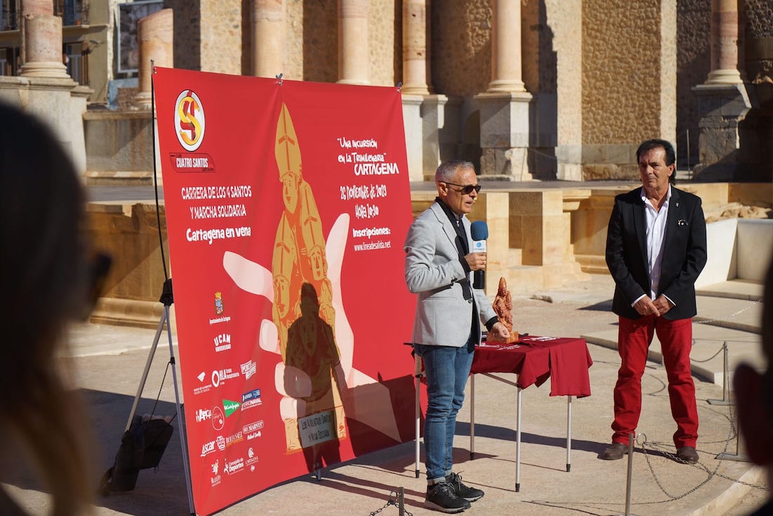 El acto de presentación de la cuarta edición de la carrera Cuatro Santos y marcha senderista fue conducido por el 'speaker' Gaspar Zamora, ofreciendo el presidente del Club Cuatro Santos, entidad organizadora, Diego Martínez Gómez, detalles sobre una prueba que tendrá un recorrido de siete kilómetros por el casco histórico de Cartagena, pasando por el interior del Arsenal y culminando en el Castillo de la Concepción. La salida para corredores y senderistas será a las 10.30 horas. Sobre las 12.30 horas está prevista la entrega de premios y el inicio del concierto de 'Stolen' en la zona de meta. La faceta solidaria de esta cita estará dirigida al Banco de Alimentos de la Región de Murcia de Cartagena.