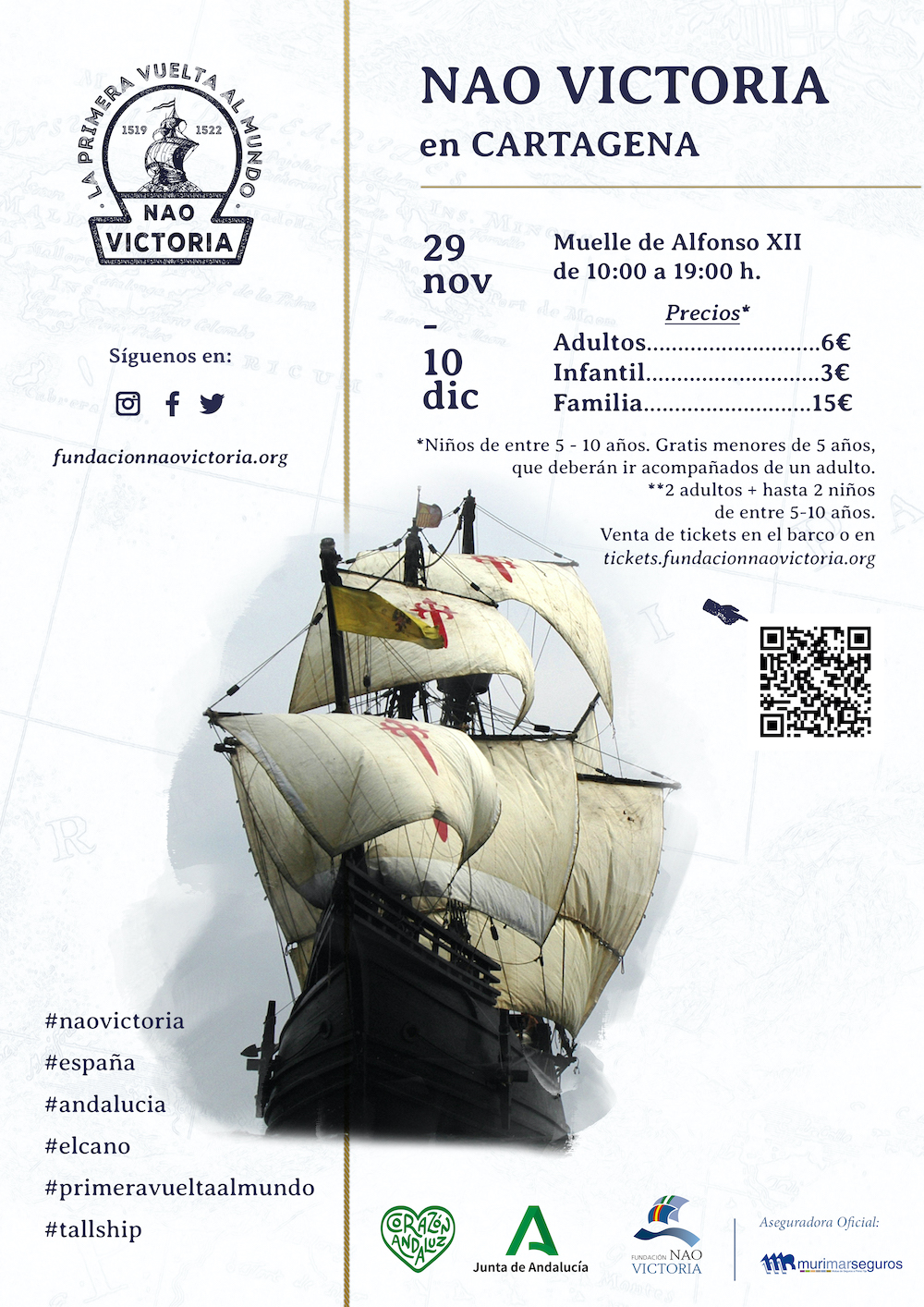 La Nao Victoria visitará y atracará en Cartagena. La Nao Victoria se encuentra como embajadora de corazón andaluz para promocionar los productos de Andalucía por los puertos de España que visite en esta gira. Imponente navío, réplica del navío que dio la primera vuelta al mundo. La Nao Victoria podrá ser visitada del 29 de noviembre al 10 de diciembre en horario de 10:00H a 19:00H de manera ininterrumpida. Un museo flotante, con una exposición en la que se pueden visitar sus cubiertas para descubrir la historia marítima de una forma única.