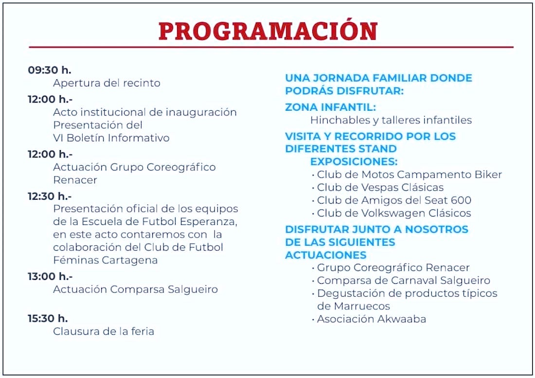 La novena edición de la muestra de colectivos de la barriada se celebra este domingo en el puerto de Cartagena con un animado programa y espectáculos que ofrecerán Renacer y Salgueiro, la presentación de la EF Esperanza, degustaciones de la gastronomía marroquía, presencia de clubes de motos y vehículos clásicos, hinchables para niños, talleres...