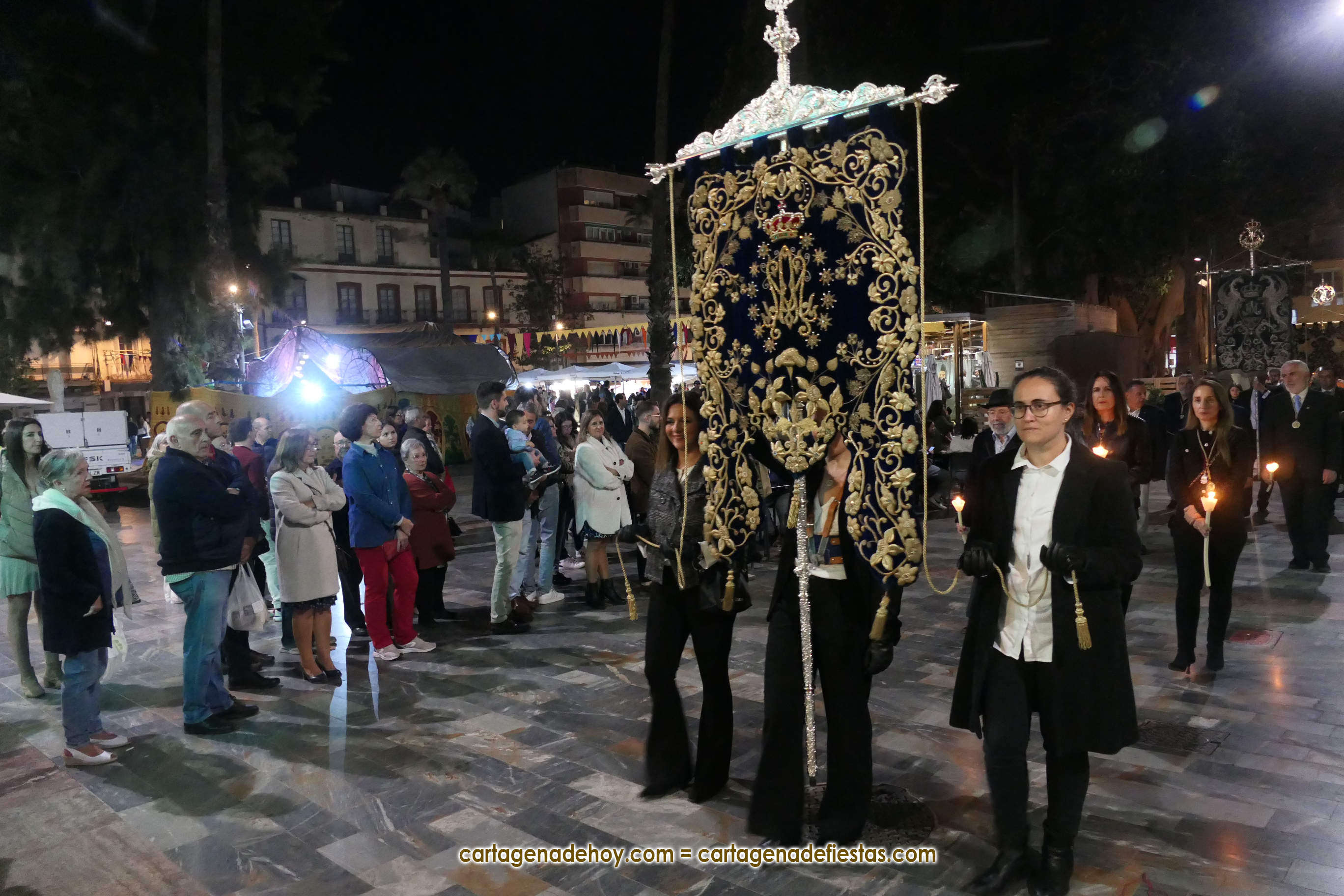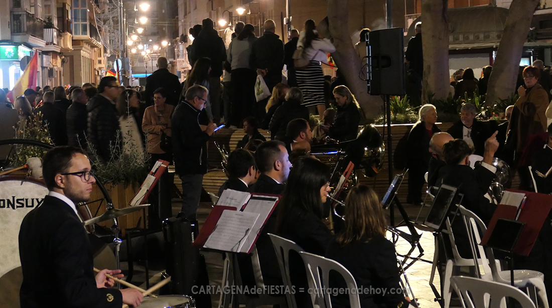 En la plaza de Juan XXIII, entre el lugar donde fue la manifestación generada por el malestar generado por las concesiones del líder socialista a los nacionalistas, donde se sucedieron los cánticos contra Sánchez y Puigdemont. Por tal motivo, la AC Modernistas de Levante de Cartagena demoró el inicio de su gala musical media hora, cuando, al ver que las protestas se prolongaban, decidieron activar su concierto y bailes, lo que provocó que, por ejemplo, ‘Suspiros de España’ se escuchases con el fondo de ‘¡Sánchez dimisión!’, entre otros cánticos, y a la inversa, que pasodobles acompañasen a gritos de repulsa.