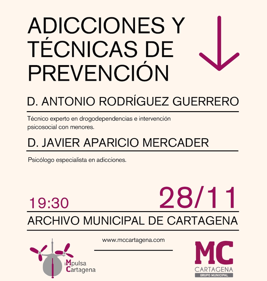 El Grupo municipal MC Cartagena ha anunciado esta mañana que llevará a cabo una nueva edición de su ya tradicional `Impulsa Cartagena´, que en esta ocasión estará dedicado a las `Adicciones y técnicas de prevención´, charla que tendrá lugar el martes 28 de noviembre a las 19:30 horas en la sala multiusos del Archivo Municipal, y que estará conducida por Antonio Rodríguez Guerrero, Técnico experto en drogodependencias e intervención psicosocial con menores; a quien acompañará Javier Aparicio Mercader, psicólogo especialista en adicciones. Según la portavoz adjunta de MC Cartagena, Mercedes Graña, “una vez más, MC demuestra su preocupación por mejorar todos los ámbitos de la sociedad cartagenera y, en este caso, ha decidido dedicar una edición del ciclo `Impulsa Cartagena´ al tema de las adicciones, una lacra que desgraciadamente está en crecimiento con sus diferentes variedades”.