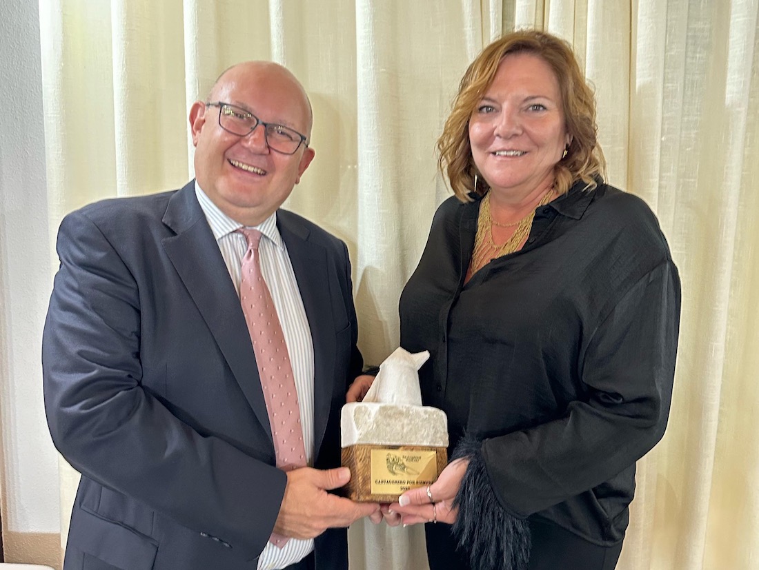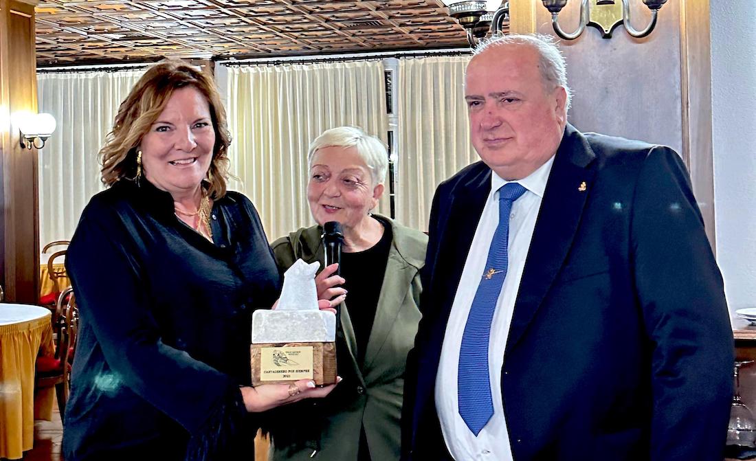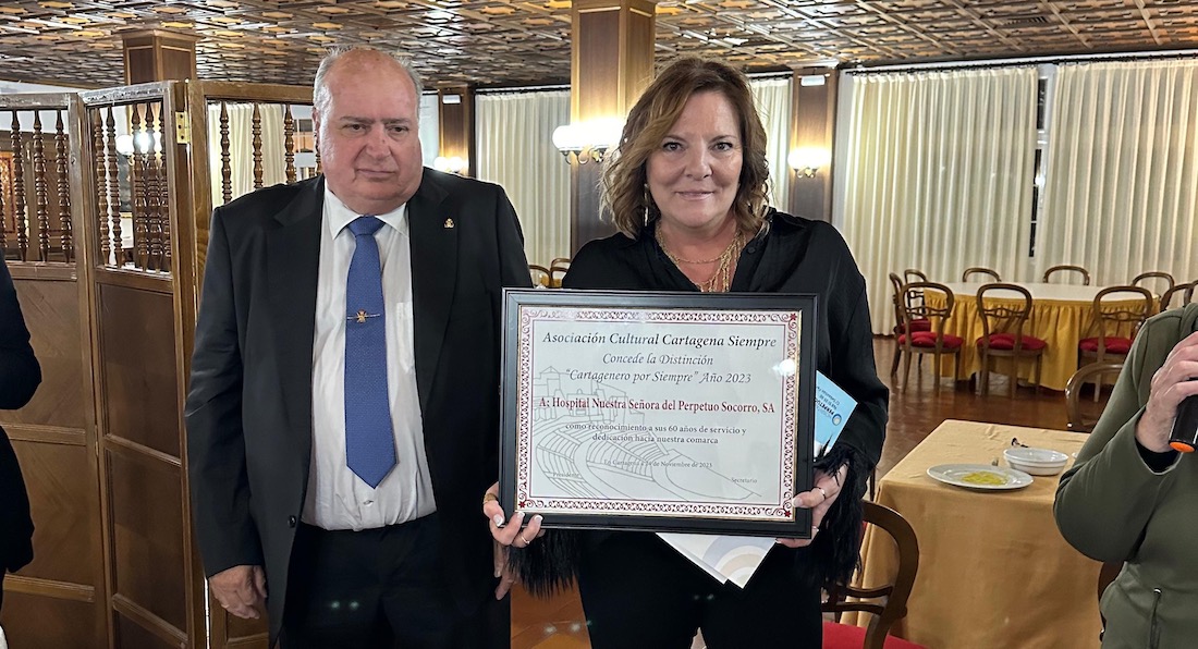 La empresa sanitaria, que comenzó su andadura hace sesenta años y ha mostrado siempre una continua línea de crecimiento, recibió el máximo galardón anual de la asociación 'Cartagena siempre', el cual fue entregado por su presidente, Fulgencio Sevilla, y por la periodista Chelo Cánovas, como se observa en la imagen.