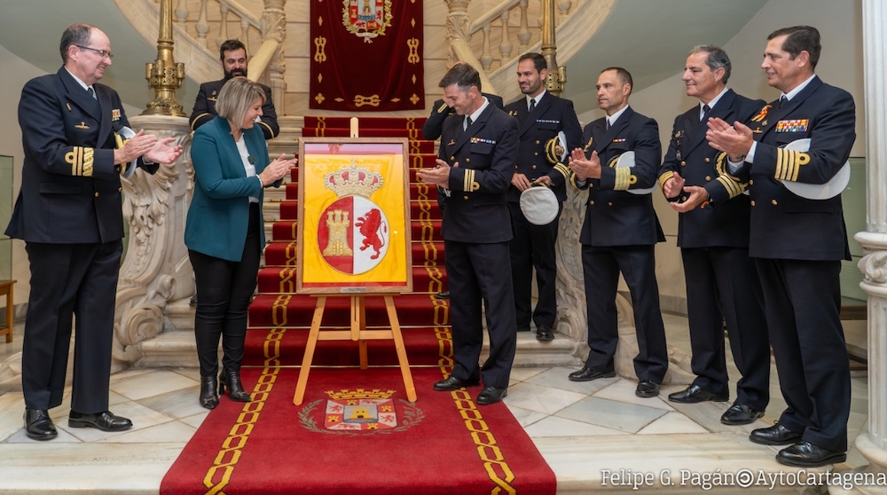 La dotación de quilla del nuevo submarino Isaac Peral de la Armada Española ha visitado el Palacio Consistorial de Cartagena, donde ha recibido la histórica reproducción de la enseña y de las llaves de la ciudad.
