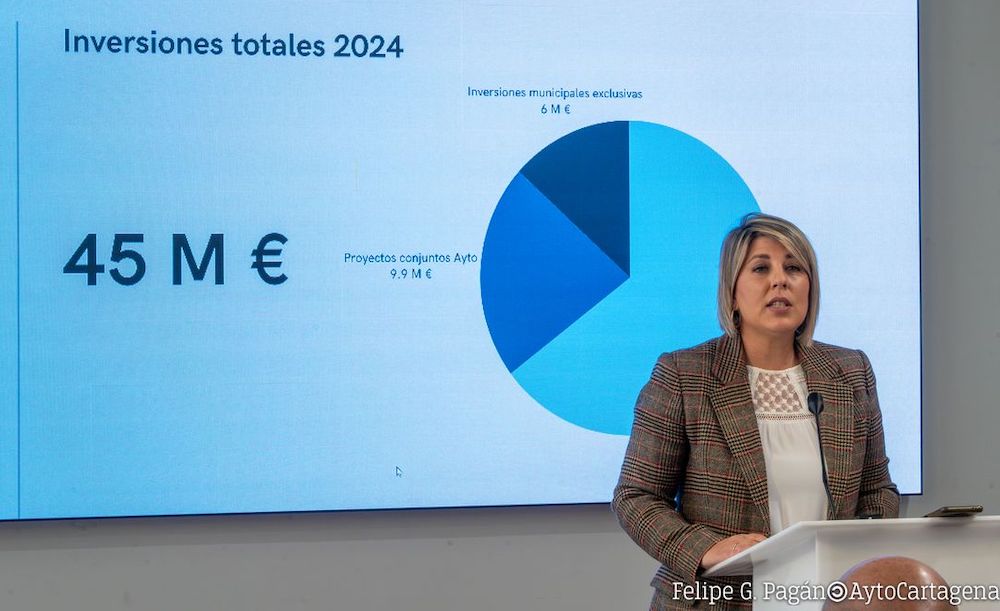 El Ayuntamiento de Cartagena gestionará en 2024 un total de 45 millones de euros en inversiones “la mayor cifra de las últimas décadas del municipio”, según anunció hoy la alcaldesa de Cartagena, Noelia Arroyo, durante la presentación del presupuesto municipal para el próximo año.