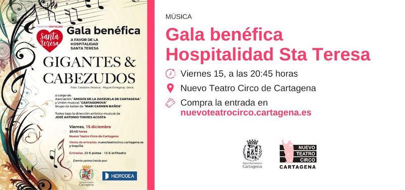 Gala benéfica Hospitalidad Santa Teresa, a las 20:45 horas, en el Nuevo Teatro Circo. Colaboran la asociación lírica musical de Amigos de la Zarzuela de Cartagena, la Unión Musical Cartagonova, y el grupo de Ballet de Mari Carmen Baños, con la puesta en escena de la zarzuela Gigantes y Cabezudos de Fdez. Caballero y Miguel Echegaray, todo ello bajo la dirección artística del Maestro Jose Antonio Torres Acosta. Las entradas tienen un precio de entre 15 y 20 €. Más información.