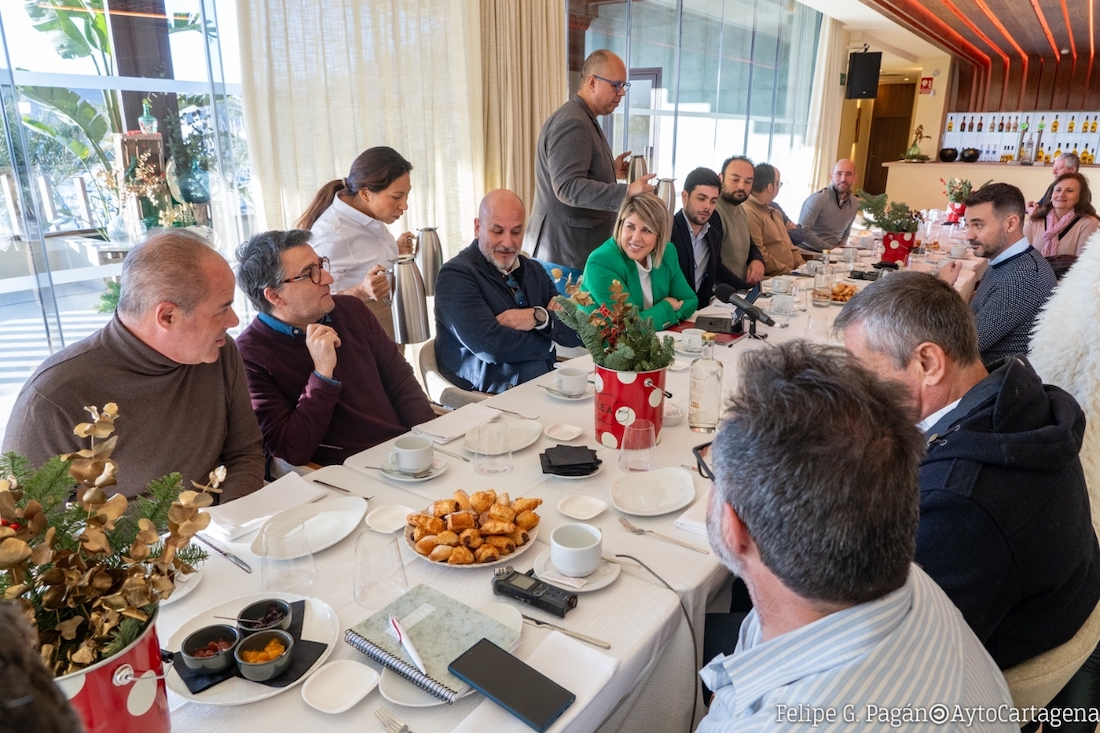 Noelia Arroyo ha protagonizado el tradicional almuerzo prenavideño de la regidora del municipio con los medios de comunicación, que este año ha tenido como marco el novedoso 'Cuarentaytrés'. La regidora del municipio ha hablado de diversos temas, figurando entre los primeros los fangos y secos del Mar Menor ("esta semana comienzan a retirarse los de Estrella de Mar"), el descenso del desempleo en el municipio y el nuevo Plan General de Ordenación Urbana, del que, más en febrero que en marzo, vaya al pleno municipal para su aprobación inicial, esperando que para entonces todo "esté supervisado para evitar defectos de forma otra vez". También ha hablado de la nueva marca de Cartagena, terreno en el de la promoción turística en el que ve "posible ir en solitario a Fitur, pero nos dicen que es mejor hacerlo en conjunto", apunta.