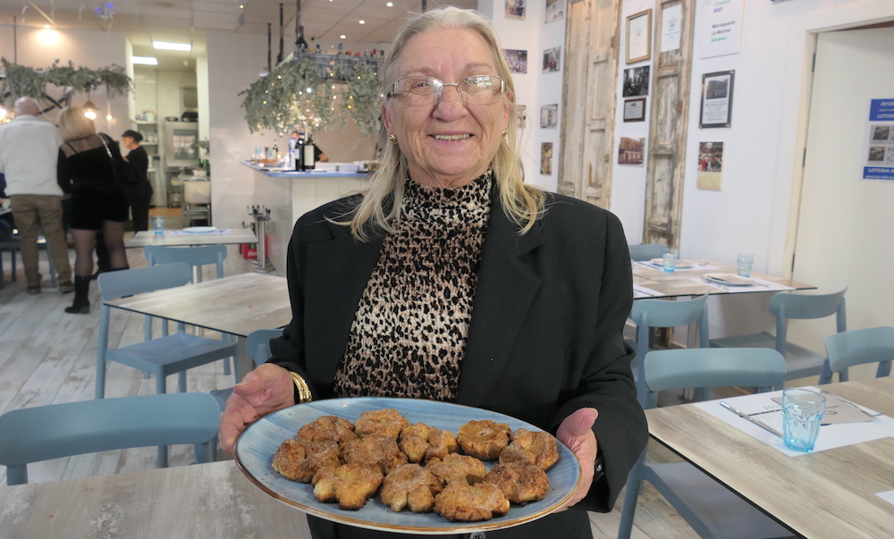 Imagen de Sera, vecina de la villa y condado de Santa Lucía, con una bandeja que porta los sabrosos rollicos que ha elaborado y que son muy demandados por familiares y amigos.
