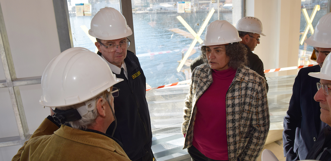 Una nueva ventana al Puerto de Cartagena. Todo en marcha para estudiantes y personal de la Escuela de Arquitectura y Edificación (ETSAE) den vida al antiguo Pañol de Regatas del Arsenal, que la UPCT está concluyendo de remodelar y cuyas obras han visitado hoy la rectora, Beatriz Miguel, y el almirante del Arsenal, Pedro Luis de la Puente, destacando los avances en la ejecución, que se encuentra al 87%, y la recuperación del uso para ideación gráfica del edificio, que albergó a los delineantes de Bazán y el próximo curso alojará docencia y prácticas de dibujo, diseño y construcción de maquetas.