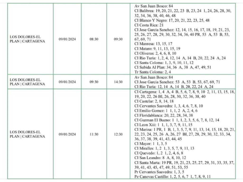 Detalle de los cortes en Los Dolores (información facilitada por la junta vecinal municipal):
