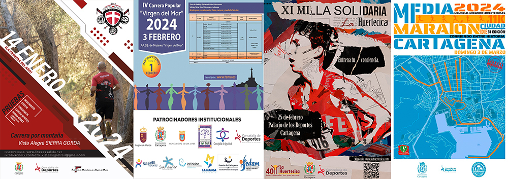 La VI CxM Sierra Gorda se disputa este domingo en media maratón, cross (9k), senderismo (9k), marcha nórdica (7 y 5k) e infantiles, la V carrera popular Virgen del Mar recorrerá 7,55 kilómetros de avenidas mangueras y acantilados de Cabo de Palos el 3 de febrero, la IX millar solidaria de la asociacion de iniciativa social de Santa Ana se celebrará el siguiente día 25 y la media maratón y 10K - Ciudad de Cartagena 'Memorial Gregorio Lorente' llegará el 3 de marzo por el casco histórico