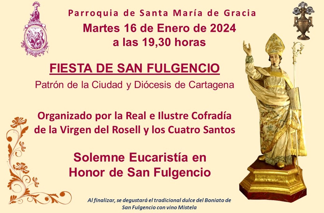 La Real e Ilustre Cofradía de la Virgen del Rosell y de los Cuatro Santos organizará el martes próximo, en la iglesia de Santa María, la celebración de la festividad del patrón de la ciudad y de la diócesis de Cartagena. Habrá eucaristía y a su conclusión se ofrecerá a los asistentes una degustación del tradicional dulce de boniato de San Fulgencio con vino de mistela.