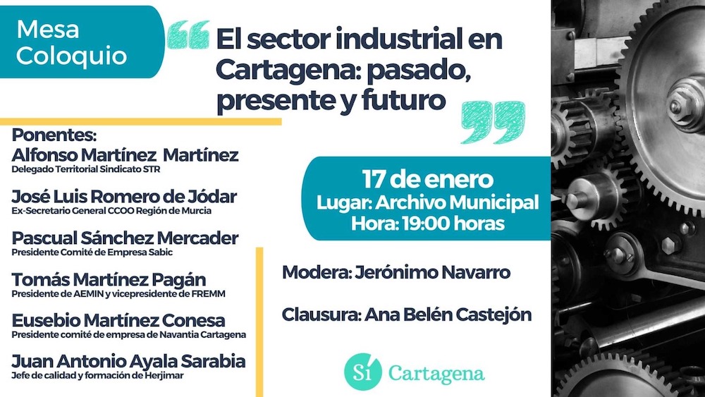 Sí Cartagena pone en marcha su primer ciclo de charlas y conferencias con la mesa coloquio ‘El sector industrial en Cartagena: pasado, presente y futuro’. El encuentro, que tendrá lugar el próximo miércoles, 17 de enero, contará con el secretario de Industria de la formación, Jerónimo Navarro, como moderador. La secretaria general de Sí Cartagena, Ana Belén Castejón, clausurará el encuentro.