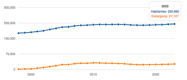 Los datos que ha cerrado el Instituto Nacional de Estadística a fecha uno de enero de 2023 reflejan que la nueva cifra se sitúa en 220.660 habitantes tras un crecimiento que casi triplica al del ejercicio anterior. La nueva subida ha sido de 1.446, muy similar al incremento de la población extranjera (1.301). Siguen aumentando los residentes fuera de la ciudad, que parece estabilizarse en 42.250 residentes y corta un línea en descenso que se inició en 2008 con la peatonalización y el adiós al colegio de San Miguel.