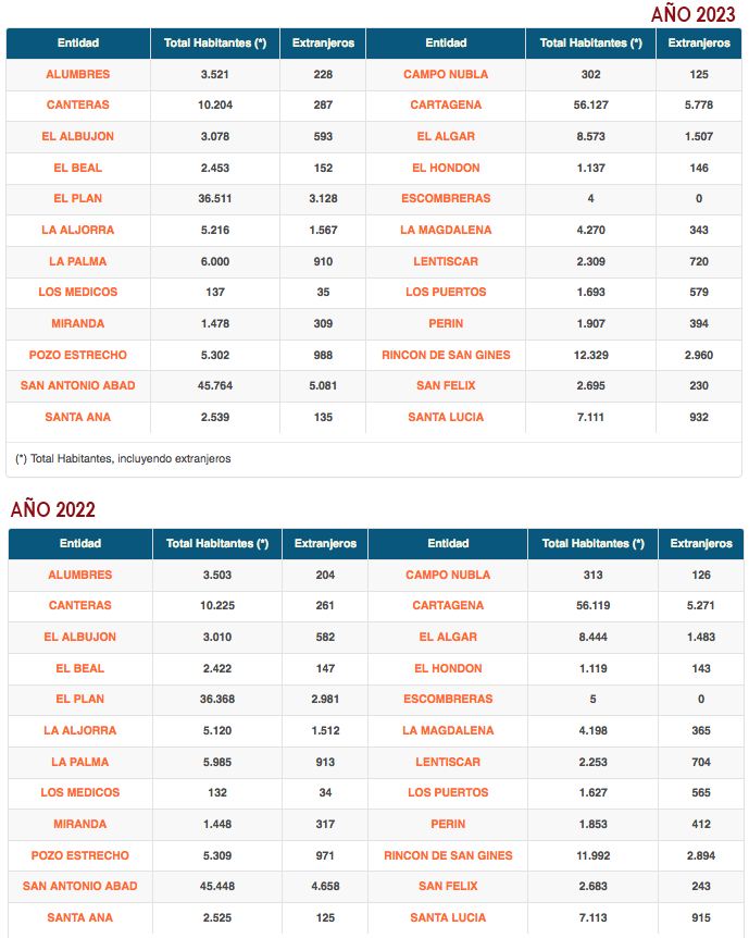 Los residentes han aumentado en casi todas las entidades con las que el Ayuntamiento desglosa el territorio cartagenero, destacando los incrementos en San Antón (140 personas) y El Algar (129), subiendo también en Los Dolores y su entorno (63) y en las poblaciones marmenorenses de Playa Honda y Los Nietos. Llama la atención el aumento de 72 residentes en La Magdalena. Por contra, bajan las cifras en Canteras (-21), Campo Nubla (-11), Santa Lucía (-2) y lo que queda de Escombreras (-1). También destaca que bajan en 4 los vecinos del Polígono Santa Ana, barriada que tuvo un auge espectacular en el primer tramo del siglo XXI, estabilizándose desde hace unos años.