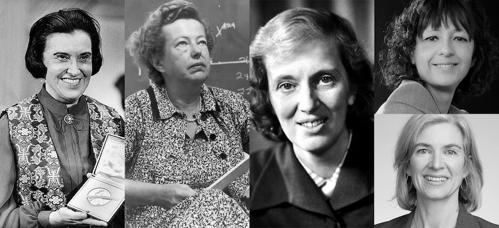 Pie de foto (De izquierda a derecha): Rosalyn Yalow, María Goeppert-Mayer, Dorothy Mary Crowfoot Hodgkin, y las científicas Emmanuelle Charpentier y Jennifer A. Doudna.