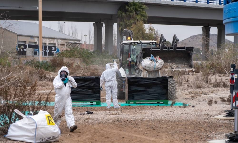 En total, se han retirado alrededor de 50 sacas, de un metro cúbico cada una de ellas. Este material se extrajo con anterioridad de una misma zona, una arqueta de la antigua fábrica de Potasas ubicada entre la autovía A-30 y la carretera de La Unión. La empresa química Ercros es la responsable de la retirada de residuos. En ella también interviene personal de una firma acreditada por el CSN, como Unidad Técnica de Protección Radiológica (UTPR), y de la empresa González Soto.