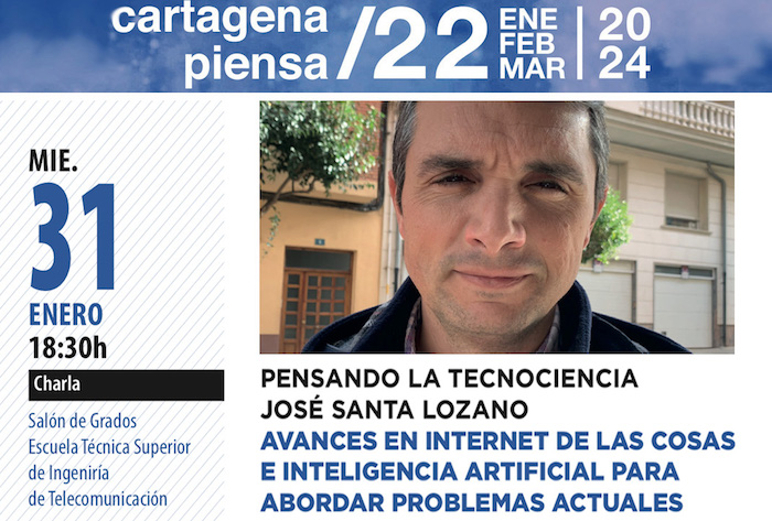 Cartagena Piensa ha abierto este temporada una nueva línea de trabajo que han llamado 'Pensado la tecnociencia' y que implica fuertemente a la UPCT. Con ella se aborda los grandes desafíos que supone la actual revolución científico-técnica que está cambiando nuestras vidas. Este trimestre se hablará de inteligencia vegetal, de transhumanismo y de Inteligencia Artificial con invitados de distintas universidades, además de José Santa Lozano, como Paco Calvo, Antonio Diéguez, María Dolores Cano, Ángeles Oñivenis, Javier G. Marín-Blázquez.