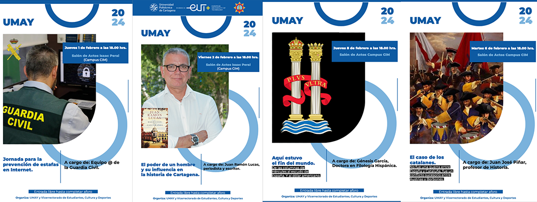 Hoy da comienzo el ciclo de conferencias organizadas por la Asociación UMAY y la Universidad de Mayores de la UPCT, ofertando contenido cultural en el período de descanso entre los dos cuatrimestres del curso 2023/2024. Todas las charlas comenzarán a las 18,00 horas en el campus de la Facultad de Ciencias de la Empresa (antiguo CIM), en la calle Real de Cartagena. Sergio Amat, vicerrector de Estudiantes, Cultura y Deportes será el encargado de la presentación de la primera y segunda cita. Las charlas están dirigidas, principalmente, a los estudiantes mayores y socios de UMAY, pero no hay problemas por asistir cualquier ciudadano que esté interesado.