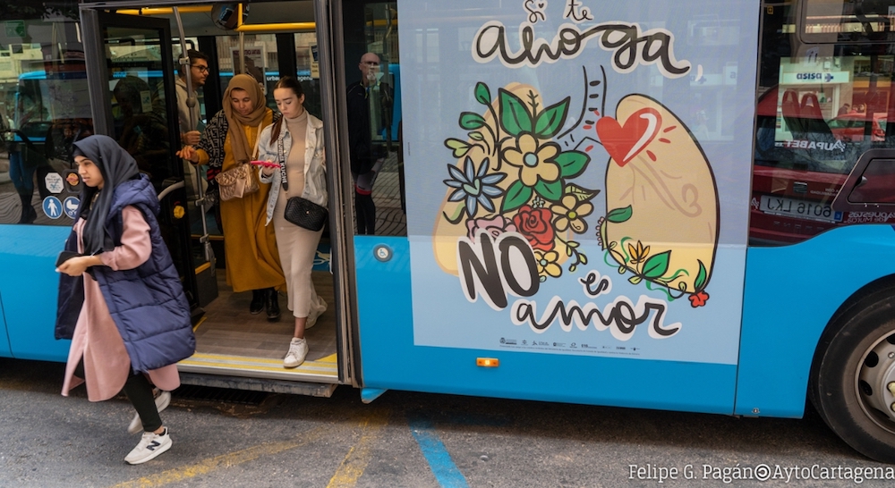 Además, ‘Si te ahoga no es amor’ busca crear conciencia social en la ciudadanía en general, a través de un amplio despliegue en publicidad a nivel visual. Estará presente en la línea 14 del bus urbano, conecta Cartagena con El Albujón, así como cartelería en mupis, centros de salud y edificios públicos.