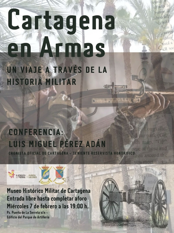 Luis Miguel Pérez Adán, integrante del equipo de cronistas oficiales de Cartagena, ofrece esta tarde la conferencia titulada 'Cartagena en armas, un viaje a través de la historia militar'. Será a las 19 horas en el Museo Histórico Militar, situado en el edificio del Parque de Artillería. Entrada libre.