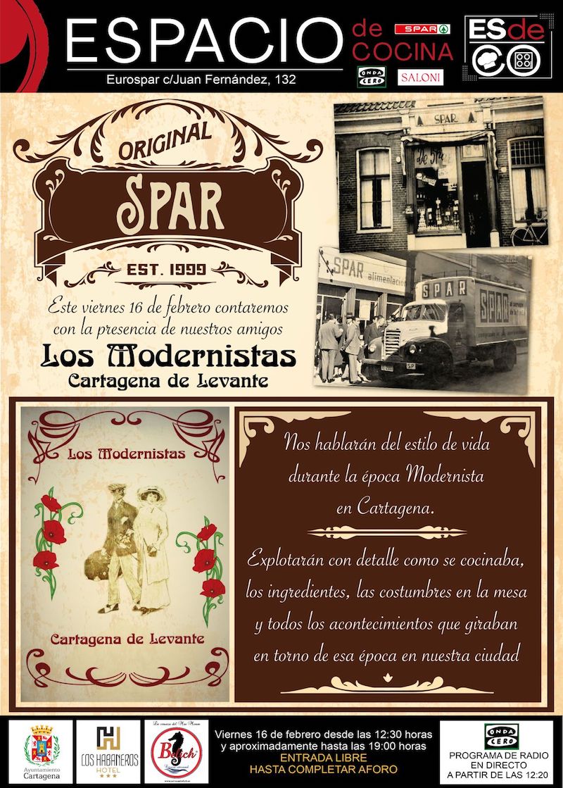 Una representación de la asociación cultural Modernistas de Cartagena de Levante acudirán hoy al 'Espacio de cocina' de Eurospar, en la calle Juan Fernández, donde hablarán de como se cocinaba hace un siglo (y algo más) y los hábitos en la mesa. Es a las 18 horas con entrada libre y también hay radio en directo a las 12.20 horas.