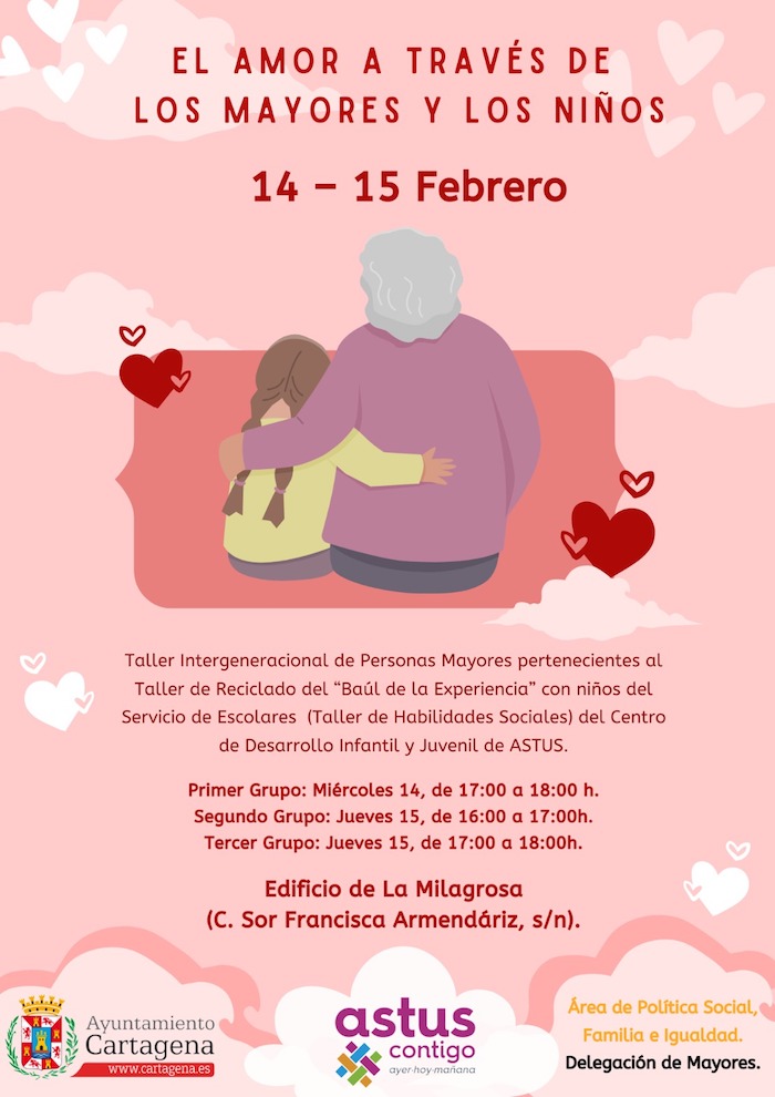 También, hoy y mañana jueves tendrá lugar una actividad intergeneracional. Bajo el título 'El Amor a través de los mayores y los niños' se realizarán en colaboración con Astus cuatro talleres donde los mayores del taller de artesanía del Baúl de la Experiencia realizarán manualidades con los niños del taller de habilidades sociales del Centro de Desarrollo Infantil y Juvenil de Astus. Estos talleres se realizarán en La Milagrosa este miércoles a las 17 horas, y el jueves a las 16 y 17 horas.