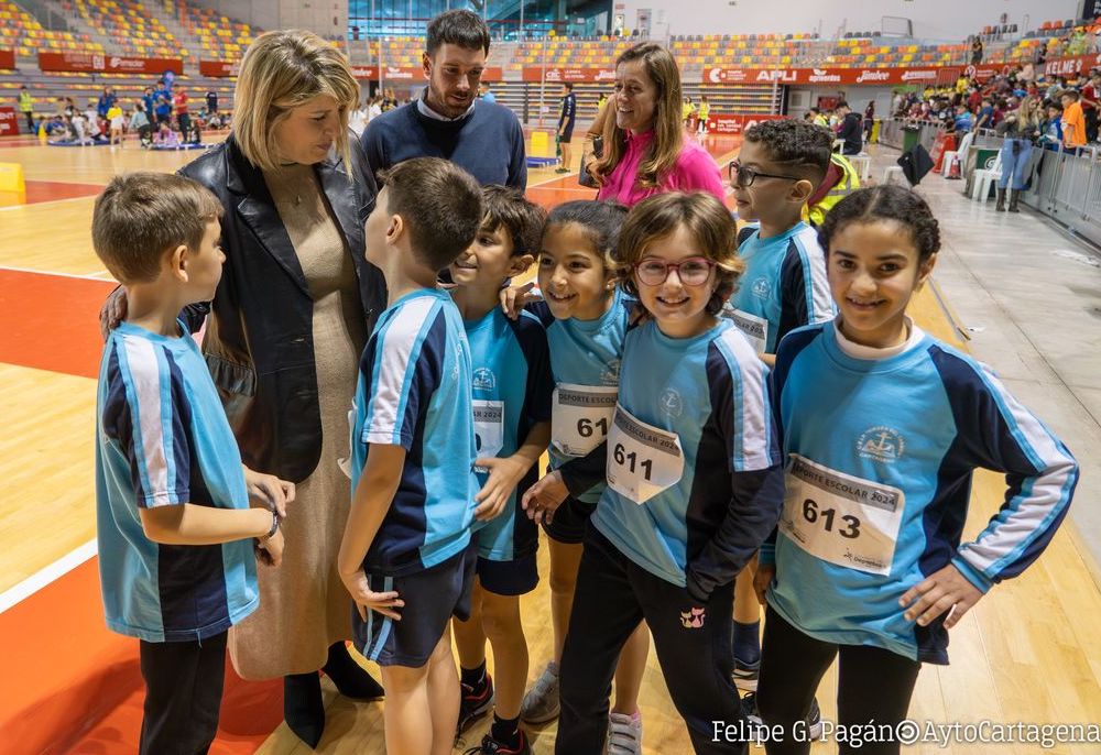 La alcaldesa de Cartagena, Noelia Arroyo, acompañada por el concejal de Deportes, José Martínez, ha compartido con los estudiantes esta jornada cuyo objetivo “es acercar el deporte del atletismo a los escolares” y explicó que se trata de una competición adaptada ya que se modifican las reglas de las diferentes disciplinas y se adaptan “para que ganen atractivo entre los alumnos, más como un juego”.
