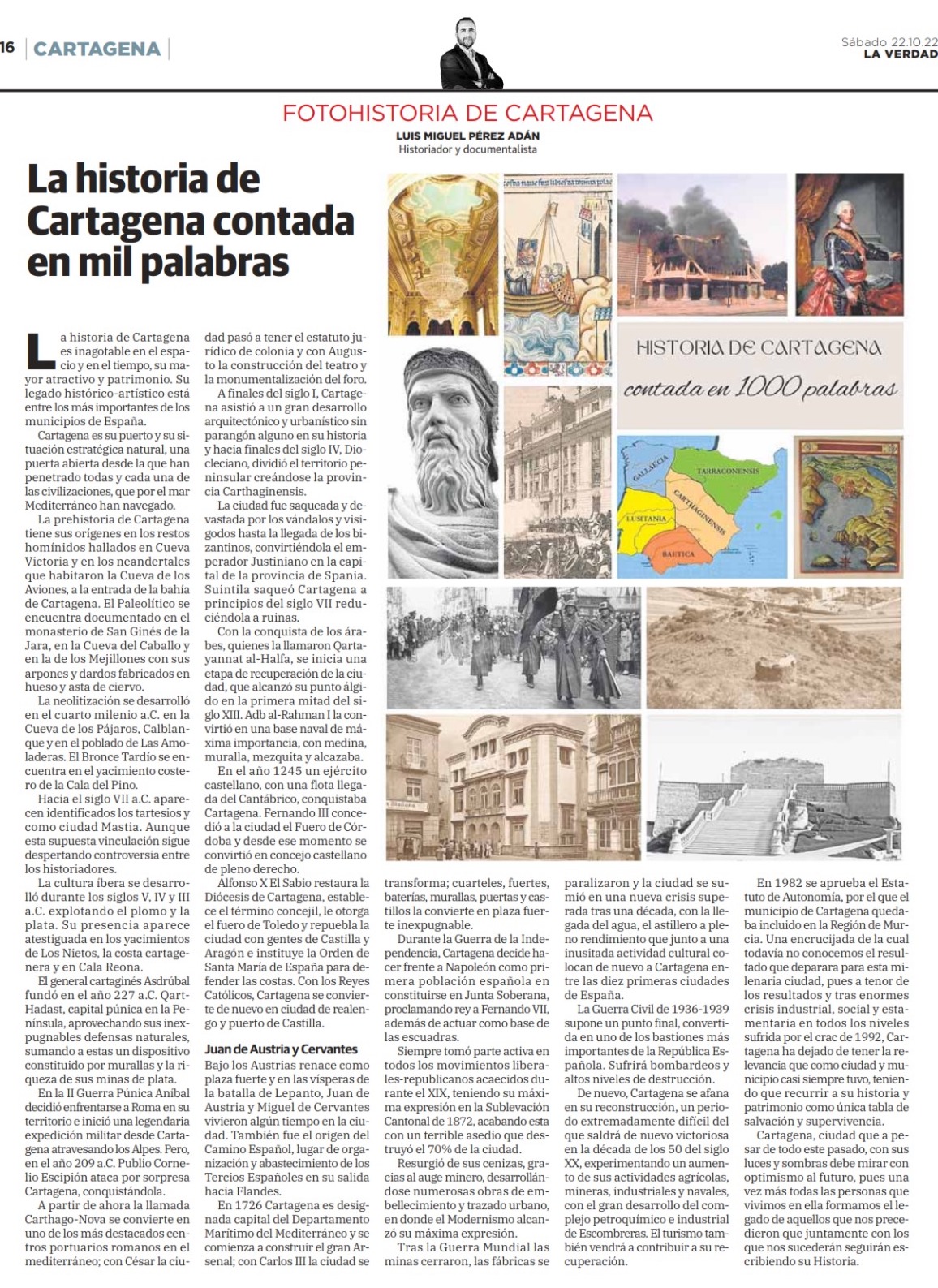 Es el brillante trabajo que ha publicado en el diario La Verdad el historiador, documentalista y arqueólogo Luis Miguel Pérez Adán, integrante del equipo de cronistas oficiales del municipio. En sólo un millar de palabras, ofrece un perfecto hilo argumental de la evolución de esta tierra desde la prehistoria hasta el siglo XXI.