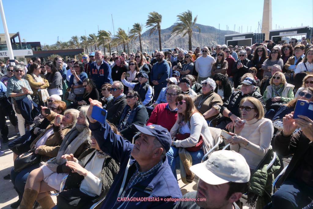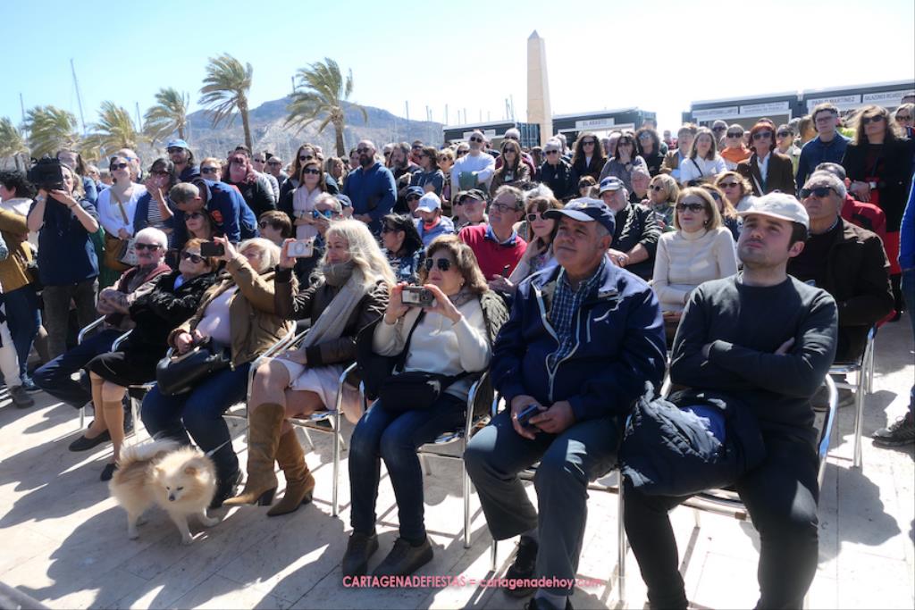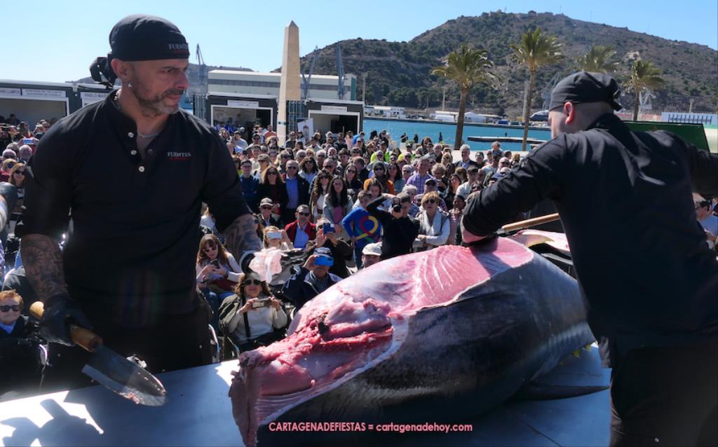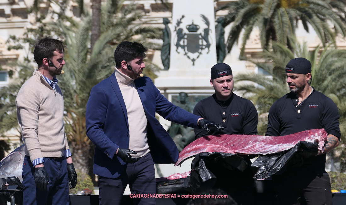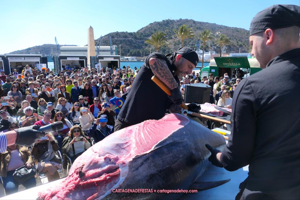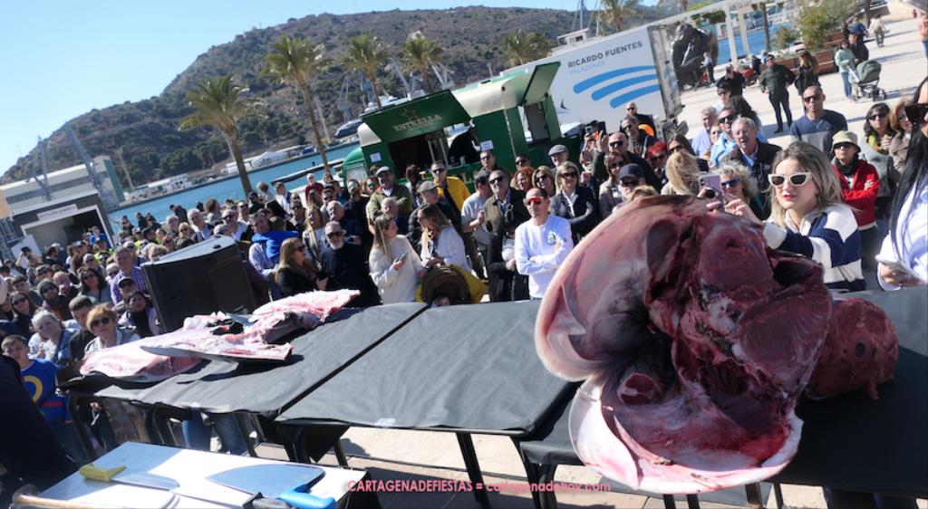 El arte del despiece del gran pez ha atraído la mirada de decenas de personas esta mañana en la explanada del puerto, dentro de los actos de las 'Jornadas gastronómicas de sol en sol' celebradas con motivo de que Cartagena es la anfitriona de la 'Gala de los Soles Repsol'.