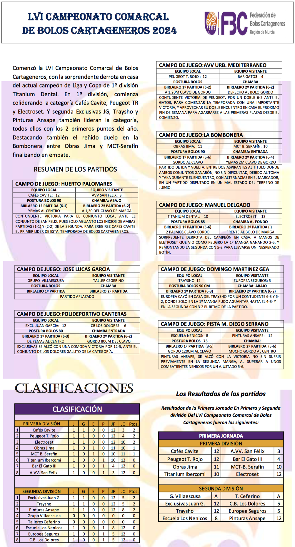 Cafés Cavite, Peugeot T.Rojo y Electroset han sido los primeros equipos que suman victorias en la jornada inaugural de la quincuagésimo sexta edición del campeonato comarcal en primera división, mientras que en segunda los primeros en saborear el triunfo han sido Exclusivas Juan G., Traysho y Pinturas Ansape.