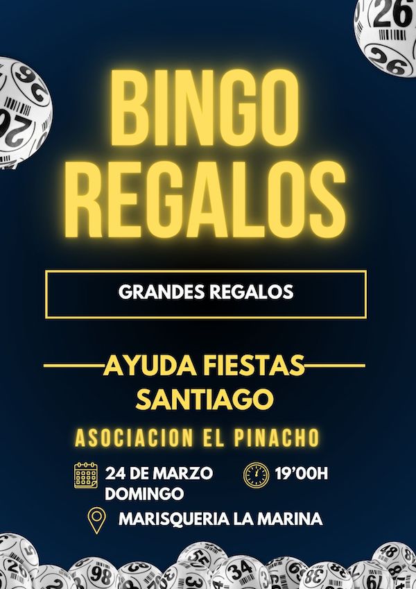 La Asociación Deportiva y Cultural El Pinacho comunica que hoy, a partir de las 19 horas, organiza una bingo de regalos en marisquería 'La Marina' con el objetivo de conseguir fondos para la organización de las fiestas en honor a Santiago Apóstol de julio en Santa Lucía.