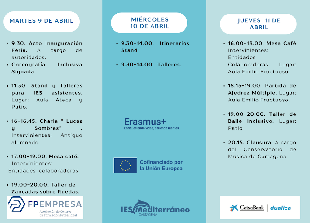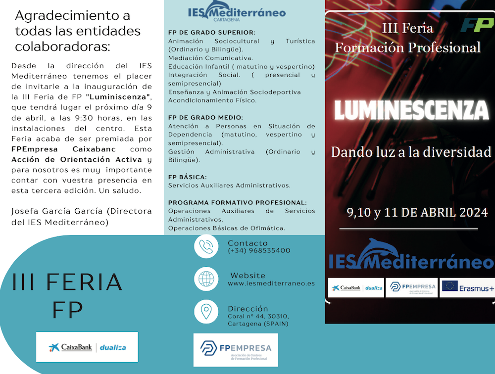 El instituto de la Urbanización Mediterráneo celebra este próximo martes, desde las nueve horas, la tercera edición de la feria de FP, que este año tiene como lema 'Dando luz a la diversidad'. La cita facilita el encuentro entre entidades del tercer sector, estudiantes del IES Mediterráneo y posibles estudiantes de Formación Profesional en la elección de su itinerario formativo, tras finalizar los cursos de la ESO o Bachillerato.