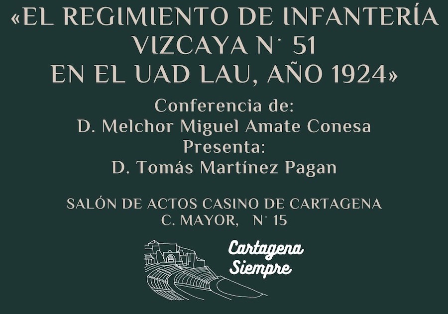La asociación cultural organiza para este jueves próximo, a partir de las 20 horas en salón de actos del Casino de Cartagena, una charla de Melchor Miguel Amate Conesa centrada en 'El regimiento de infantería Vizcaya núm. 51 en el Uad Lau, año 1924'. El presentador será Tomás Martínez Pagán.