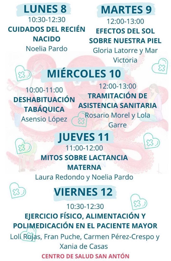 El lunes 8 comienza con Cuidados del recién nacido, el martes 9 se tratarán los efectos del sol en nuestra piel, el miércoles 10 el eje de las charlas serán la deshabituación tabáquica y la tramitación de la asistencia sanitaria. El jueves se abordarán los mitos sobre la lactancia materna y el viernes 12 culmina la semana con una charla sobre ejercicio físico, alimentación y polimedicación en el paciente mayor.