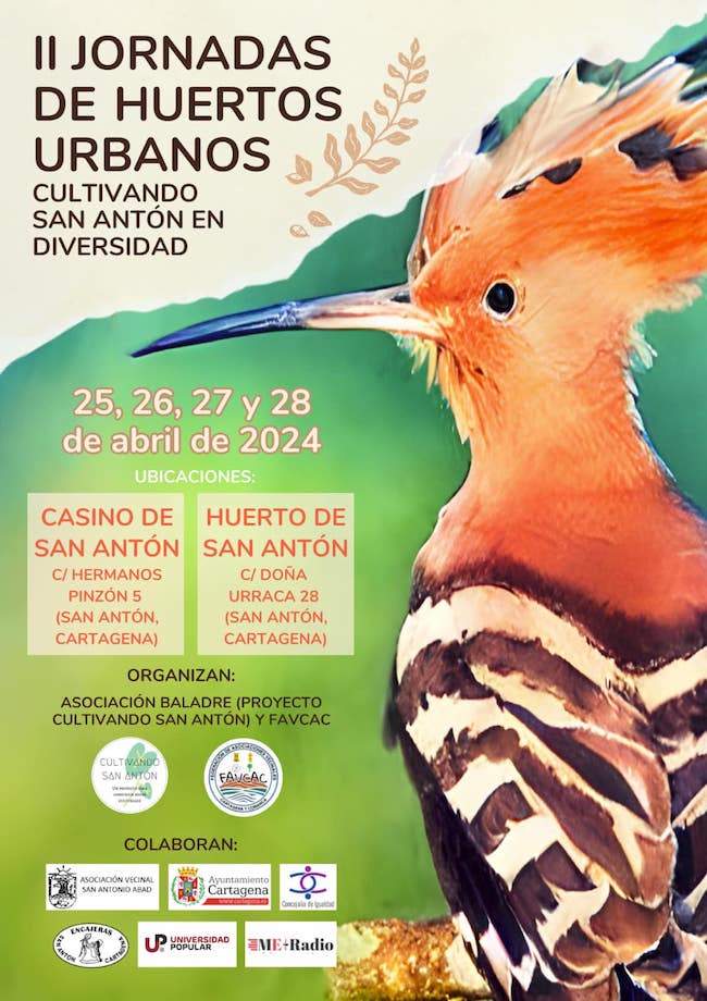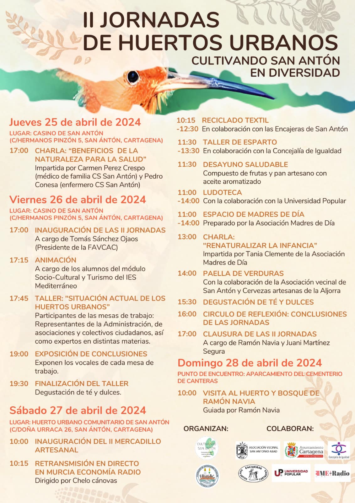 Nuevamente con el lema 'Cultivando San Antón en diversidad', se celebrarán del 25 al 28 de abril, con charlas, talleres, animaciones, mercadillo y la elaboración de un arroz de verduras. Tomás Sánchez Ojaos, presidente de la Federación de Asociaciones de Vecinos de Cartagena y Comarca, será el encargado de la inauguración. Imagen adjunta de la edición del pasado año.