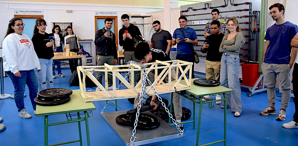 Desechando uno de los materiales que podían utilizar para construir su maqueta de puente, los cables metálicos, estudiantes de tercer curso del grado en Ingeniería Civil y del máster en Ingeniería de Caminos, Canales y Puertos han logrado con un diseño clásico de celosía un puente que ha resistido una carga de más de 350 kilos, cien veces su peso. "Hemos hecho los cálculos y el programa afirma que el diseño puede aguantar hasta una tonelada", afirmaban los orgullosos alumnos.