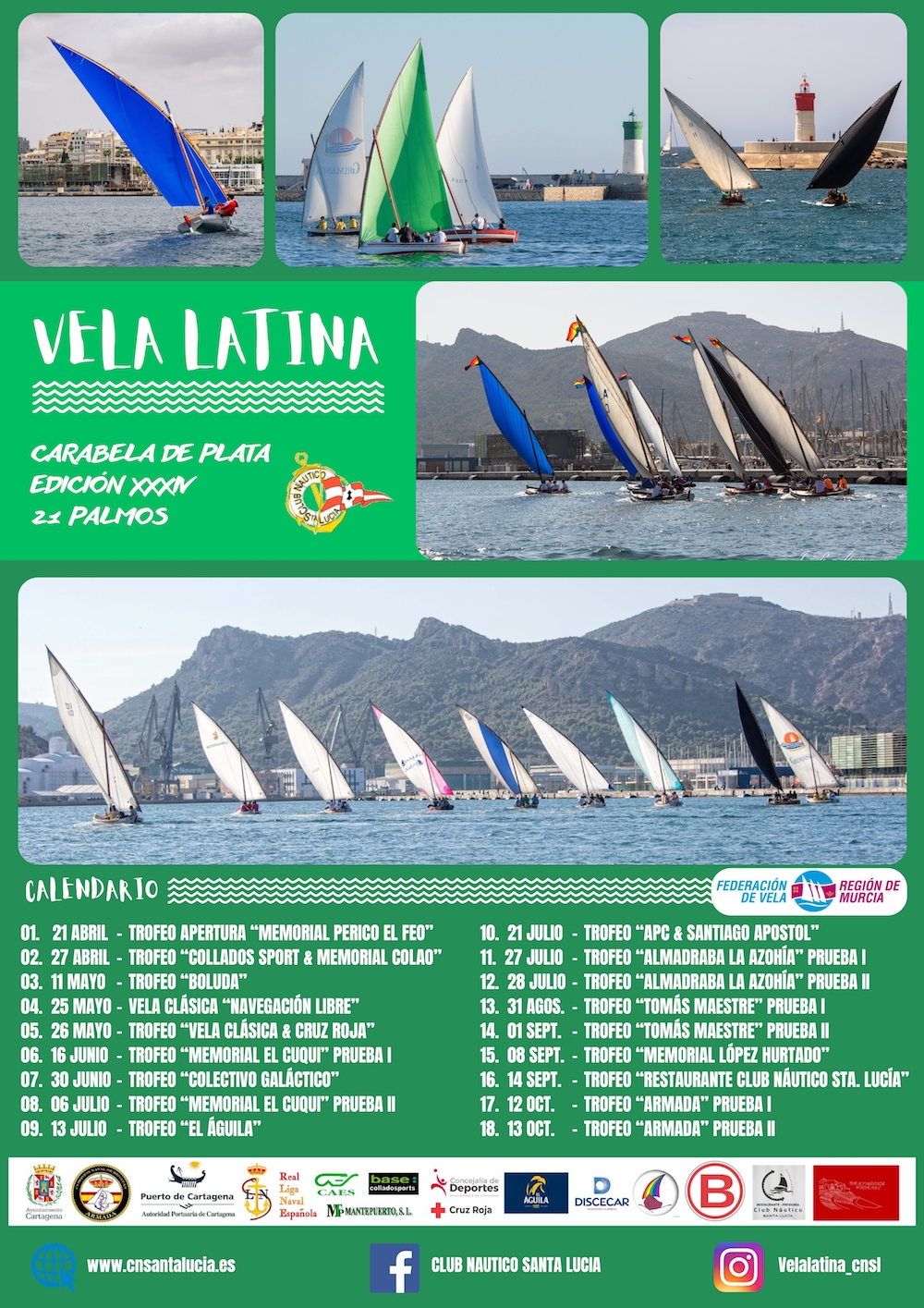 Arranca la temporada de latinos de 21 palmos con la XXXIV edición del 'Trofeo Carabela de Plata', que, organizadas por el Club Náutico de Santa Lucía con el apoyo del ayuntamiento, ofrece un calendario de 18 regatas que se disputarán en el puerto de Cartagena hasta el mes de octubre, salvo la novedosa cita de finales de julio en La Azohía. La primera prueba, denominada 'Perico el Feo', se disputa este domingo a partir de las 11.30 horas.