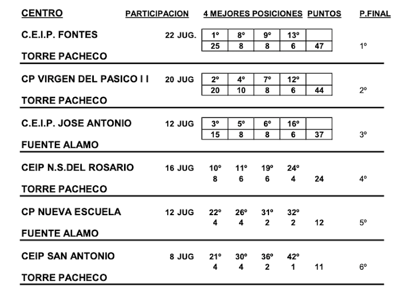 El Palacio de Deportes de Cartagena ha acogido la final regional de dominó escolar, organizada por la federación autonómica y el ayuntamiento, que ha tenido como campeón al CEIP Fontes de Torre Pacheco con el equipo formado por Jaime García Carrasco y Ángel Vidal Inglés, mientras que el segundo puesto fue para CV El Pasico II, también el municipio pachequero.