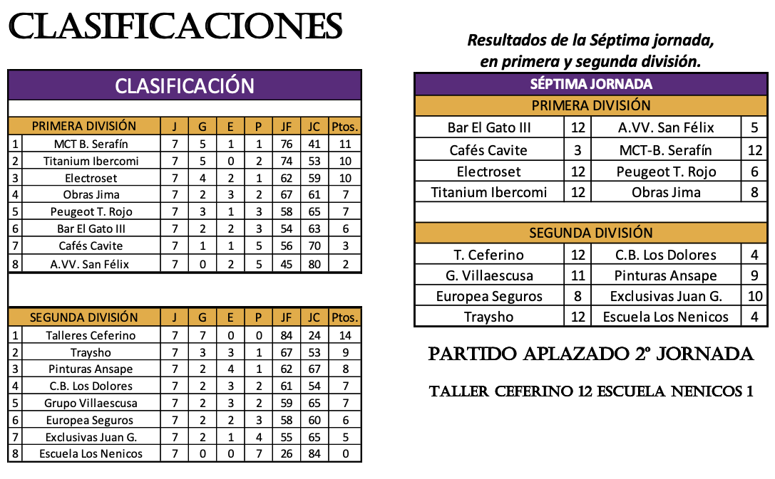 MCT-Bolos Serafín se mantiene líder con 11 puntos, seguido muy de cerca de Titanium Dental y la sorprendente gran primera vuelta que esta realizando el conjunto de Electroset. mientras que se descuelgan en esa lucha Obras Jima y Peugeot T. Rojo con 7 puntos. En segunda división pleno de victorias de Talleres Ceferino, que pone la directa a la primera división y con el titulo al alcance de la mano con 14 puntos. Foto de Cafés Cavite