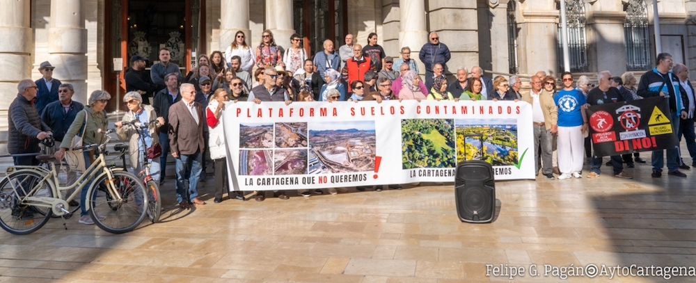 Varias decenas de personas se han manifestado en el exterior de Palacio Consistorial de Cartagena convocados por la 'Plataforma contra la contaminación de Cartagena', que expresan la dilación que está teniendo la descontaminación por parte de los poderes públicos. "Ya van tropecientos estudios y lo que urgen son actuaciones", expresaba el presidente vecinal del Sector Estación, Fulgencio Sánchez.