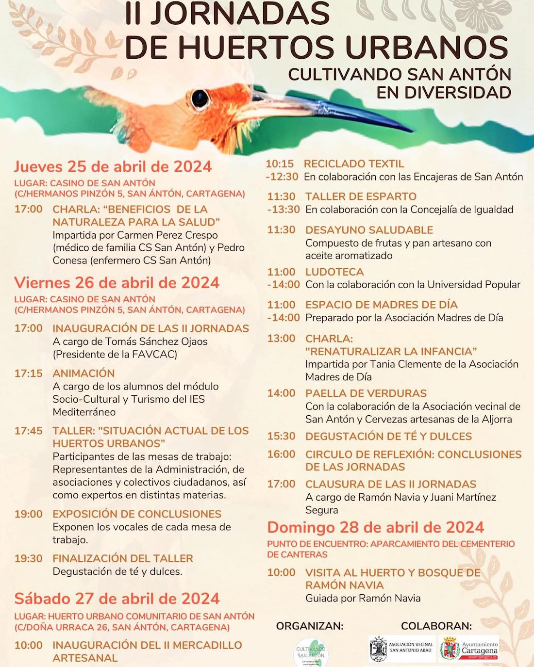 La segunda edición, bajo el lema 'Cultivando San Antón en diversidad', se inició ayer con la charla 'Beneficios de la naturaleza en la salud', que impartieron la doctora Carmen Pérez Crespo y el enfermero Pedro Conesa, ambos del centro de salud de la villa. Tuvo lugar en el Casino donde hoy habrá talleres y exposiciones, además de la inauguración oficial a cargo de Tomás Sánchez, presidente de la Federación Vecinal de Cartagena.