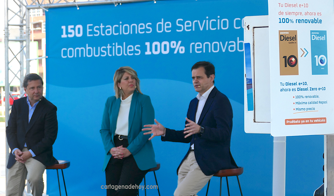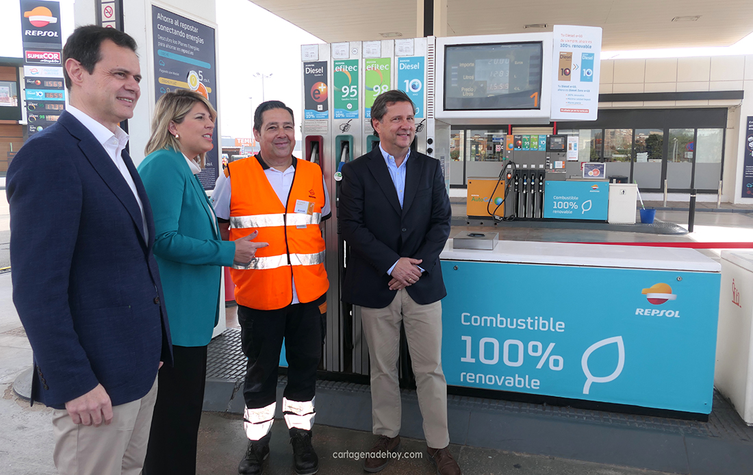El anuncio se ha realizado en la estación de servicio de la calle Ángel Bruna, en Cartagena, donde Repsol cuenta con un centro industrial donde ha puesto en marcha la primera planta de la Península Ibérica de producción de combustibles 100% renovables a gran escala.