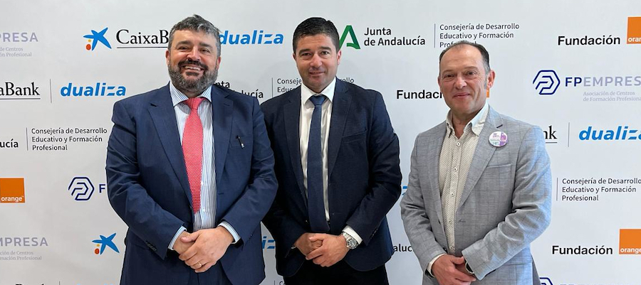 Unos mil profesionales debatirán en El Batel en abril de 2025 sobre la orientación profesional de esta modalidad de formación académica. En la foto se observa al presidente de FPEmpresa, Luis García Domínguez; al director general de Formación Profesional, Luis Quiñonero; y al director del CIFP de Hostelería y Turismo de Cartagena, Antonio García Martínez, durante el décimo congreso celebrado esta semana en Sevilla.