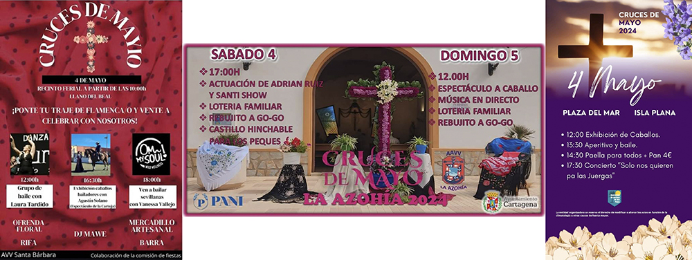 El barrio de San Diego tiene triple apuesta de cruz de mayo este fin de semana, fiesta que también se celebra en El Llano del Beal, La Azohía e Isla Plana, donde el programa incluye espectáculos caballistas. Otras propuestas son la fiesta de primavera de Alumbres (con exposición y mercadillo) y las visitas guiadas al Apolo de El Algar. En cuanto a las fiestas, Los Belones tiene romería el domingo y en San José Obrero hay noche de migas.