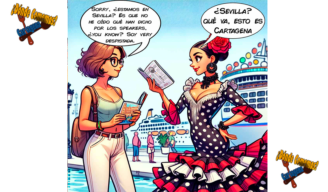 Los cruceristas que han llegado hoy a Cartagena se han encontrado con el ambientazo de las cruces de mayo en el casco histórico. Este asunto ha merecido esta simpática caricatura del portal ‘¿Dónde comemos?, Cartagena’, que dirigen Aida Belmonte y Enrique Costa.