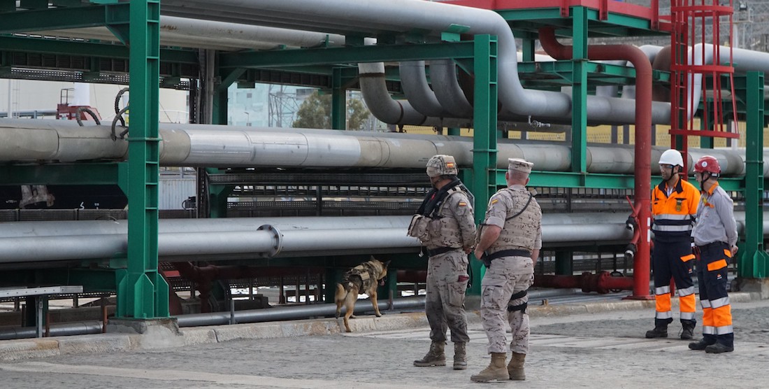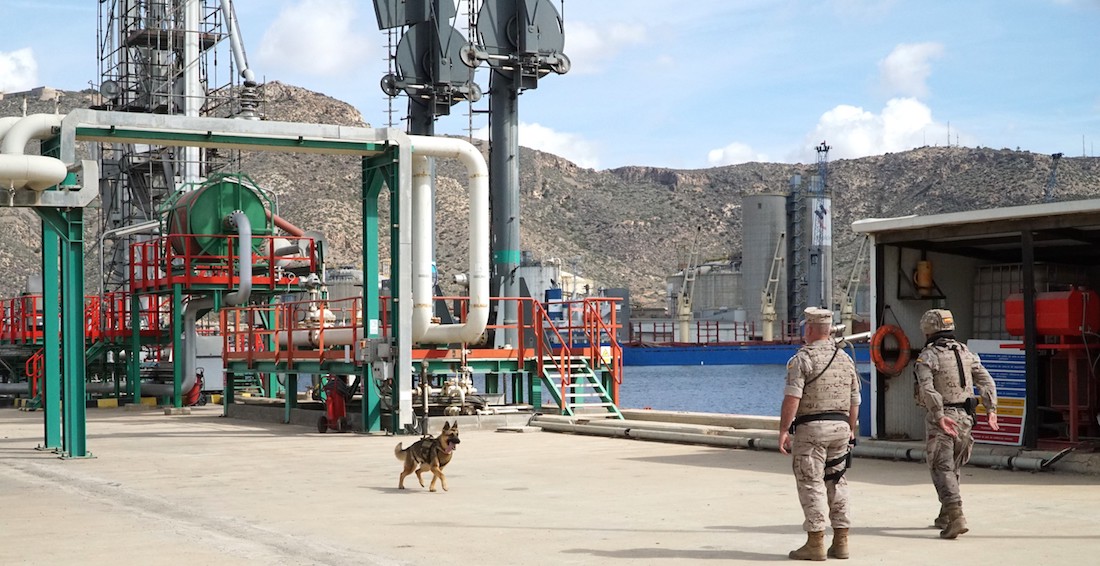 Durante la jornada de ayer, organizada por el Tercio de Levante de Infantería de Marina, con base en Cartagena, se han simulado dos escenarios en el terminal marítimo donde Repsol realiza sus operaciones. Uno de ellos ha consistido en la localización simulada de explosivos, y el otro ha servido para que los perros y sus guías entrenaran la búsqueda de intrusos en un espacio determinado. De manera paralela, se ha desplegado otro dispositivo en la carretera de El Gorguel para ejercitar el rastreo tanto en vehículos como personas.