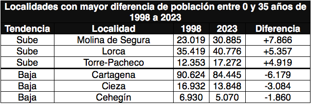 A esta localidad le sigue Lorca, que en 1998 registró 35.419 personas menores de 35 años y, en 2023, 40.776, una diferencia de +5.357 habitantes entre 0 y 35 años.